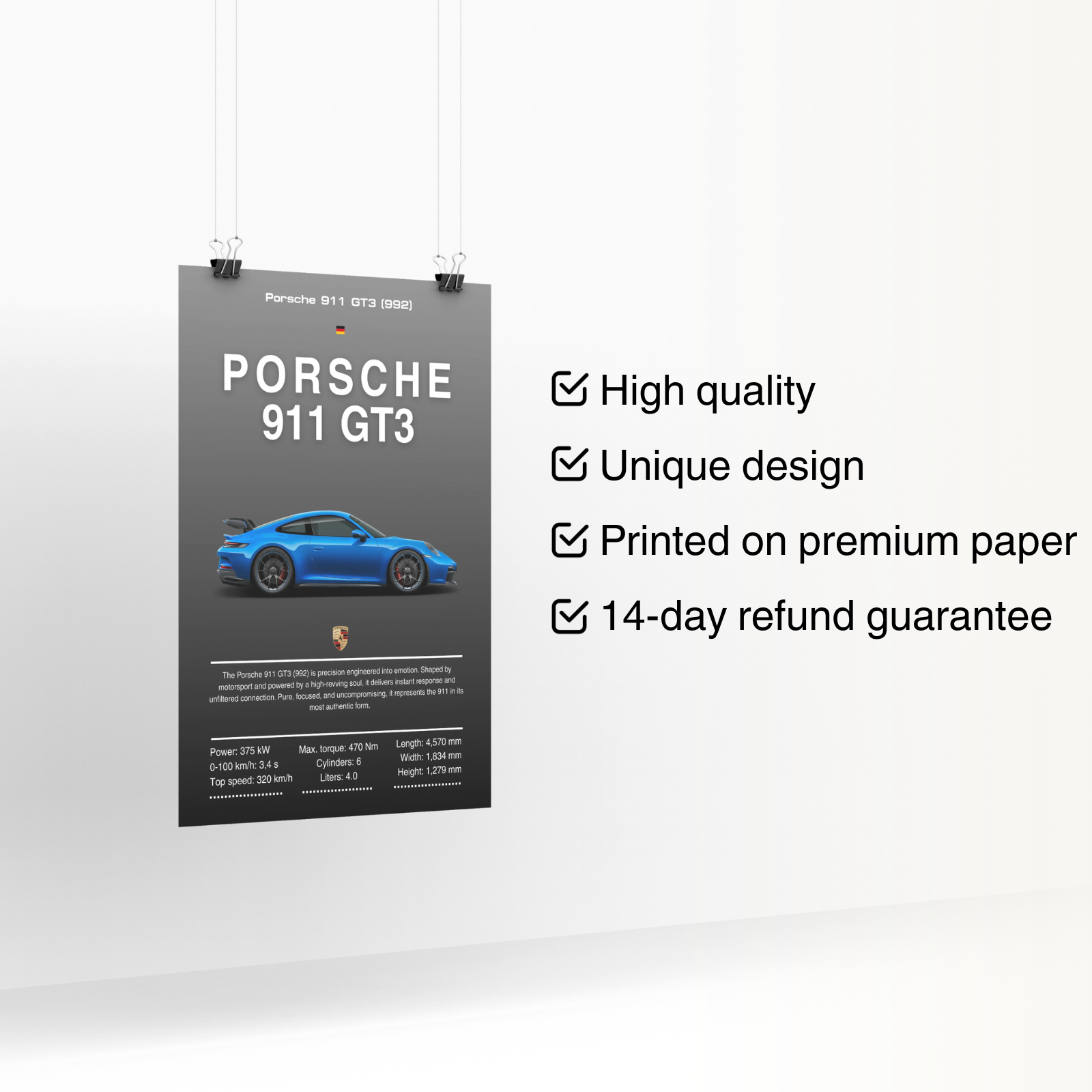 This poster features the Porsche 911 GT3 in a carefully crafted, technical design that highlights its balance of performance, engineering, and emotion.